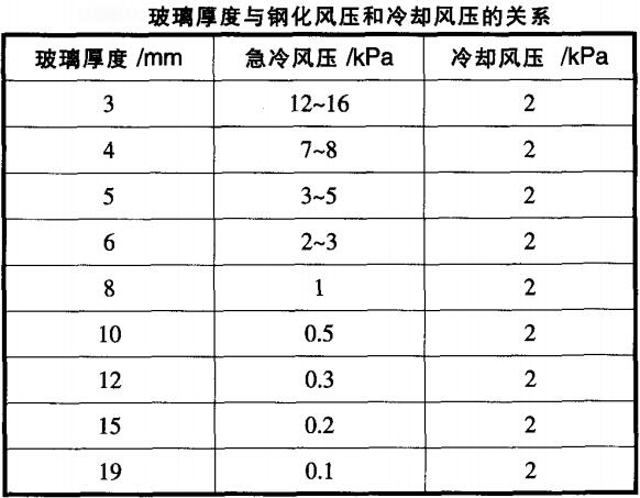玻璃在鋼化爐風(fēng)冷段進(jìn)行冷卻時(shí),風(fēng)柵與玻璃間的距離對施加在玻璃表面的風(fēng)壓將產(chǎn)生影響,當(dāng)吹風(fēng)時(shí)的風(fēng)壓定時(shí),風(fēng)柵與玻璃之間的間距變小,施加到玻璃表面的風(fēng)壓將相對增大,其碎片數(shù)量、機(jī)械強(qiáng)度和安性能都會得到提高;反之 ,如果風(fēng)柵與玻璃之間的間距增大,施加到玻璃表面的風(fēng)壓將相對減小,玻璃鋼化后表面獲得較小的應(yīng)力,其碎片數(shù)量 、機(jī)械強(qiáng)度、安性能就會相對較差;當(dāng)鋼化時(shí)的風(fēng)壓不變時(shí),定程度上我們可以通過調(diào)節(jié)風(fēng)柵與玻璃之問的距離來達(dá)到調(diào)節(jié)鋼化玻璃質(zhì)量的目的,但也不能味地調(diào)小風(fēng)柵與玻璃間的距離 ,距離過小將加大鋼化后玻璃表面出現(xiàn)應(yīng)力斑。不同厚度的玻璃的風(fēng)柵與玻璃之間的距離調(diào)節(jié)范圍可參照下表進(jìn)行玻璃鋼化爐冷卻過程工藝參數(shù)的設(shè)定 。